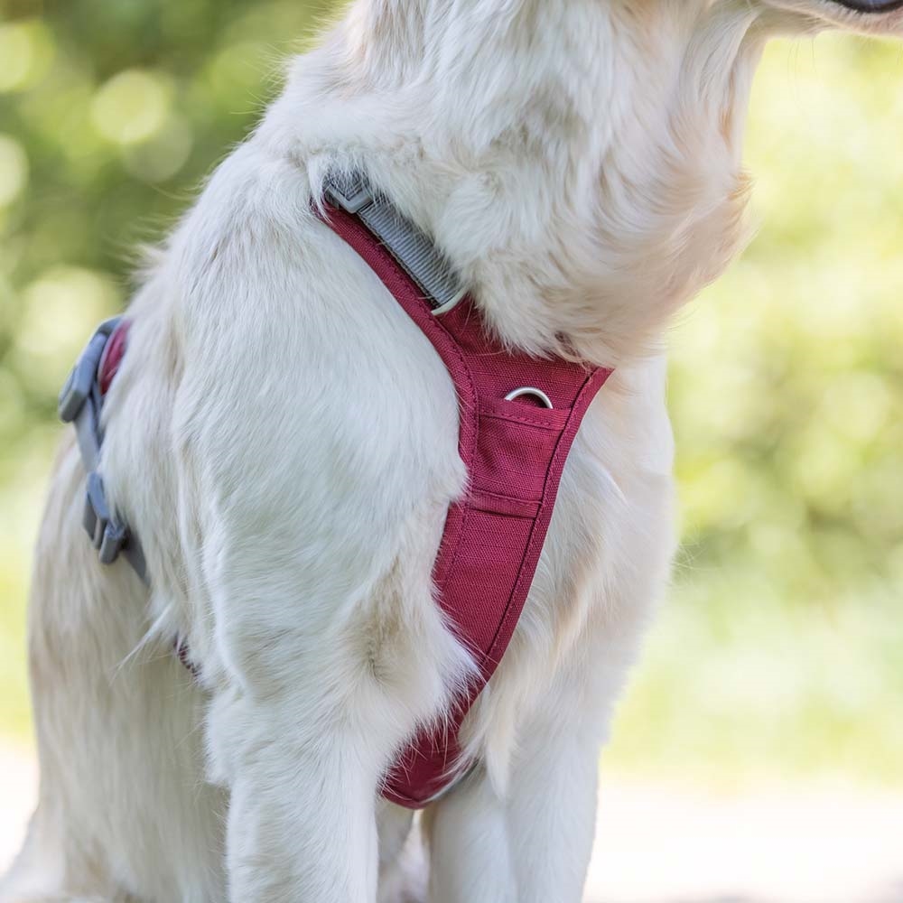 Selen är designad med en v-hals som minskar trycket på hundens halsområde. Den sitter riktigt bra på de flesta hundar.