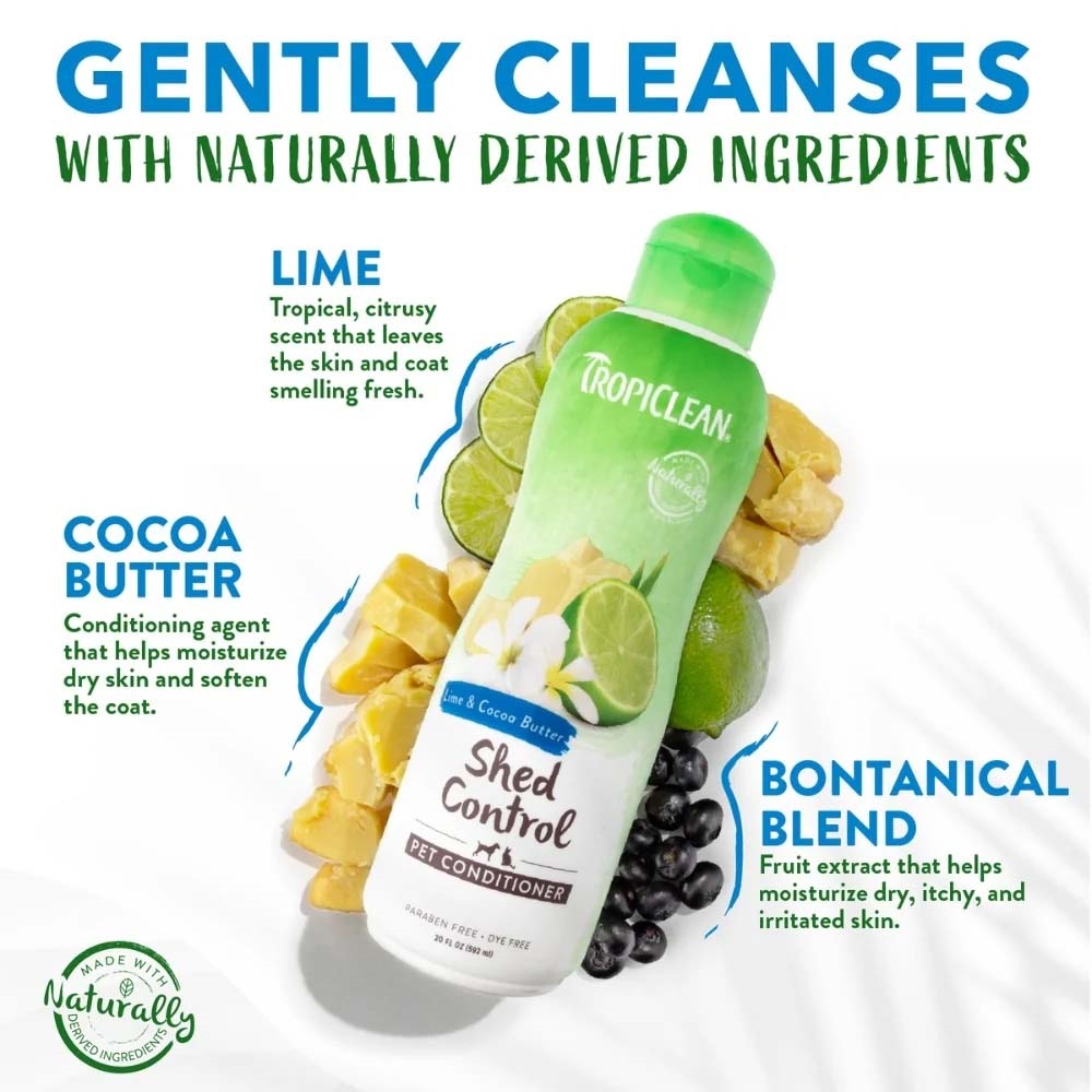 • Minskar fällning: TropiClean Lime & Cocoa Butter Shed Control Conditioner återfuktar och vårdar hud och päls hos husdjur för att minska fällning.