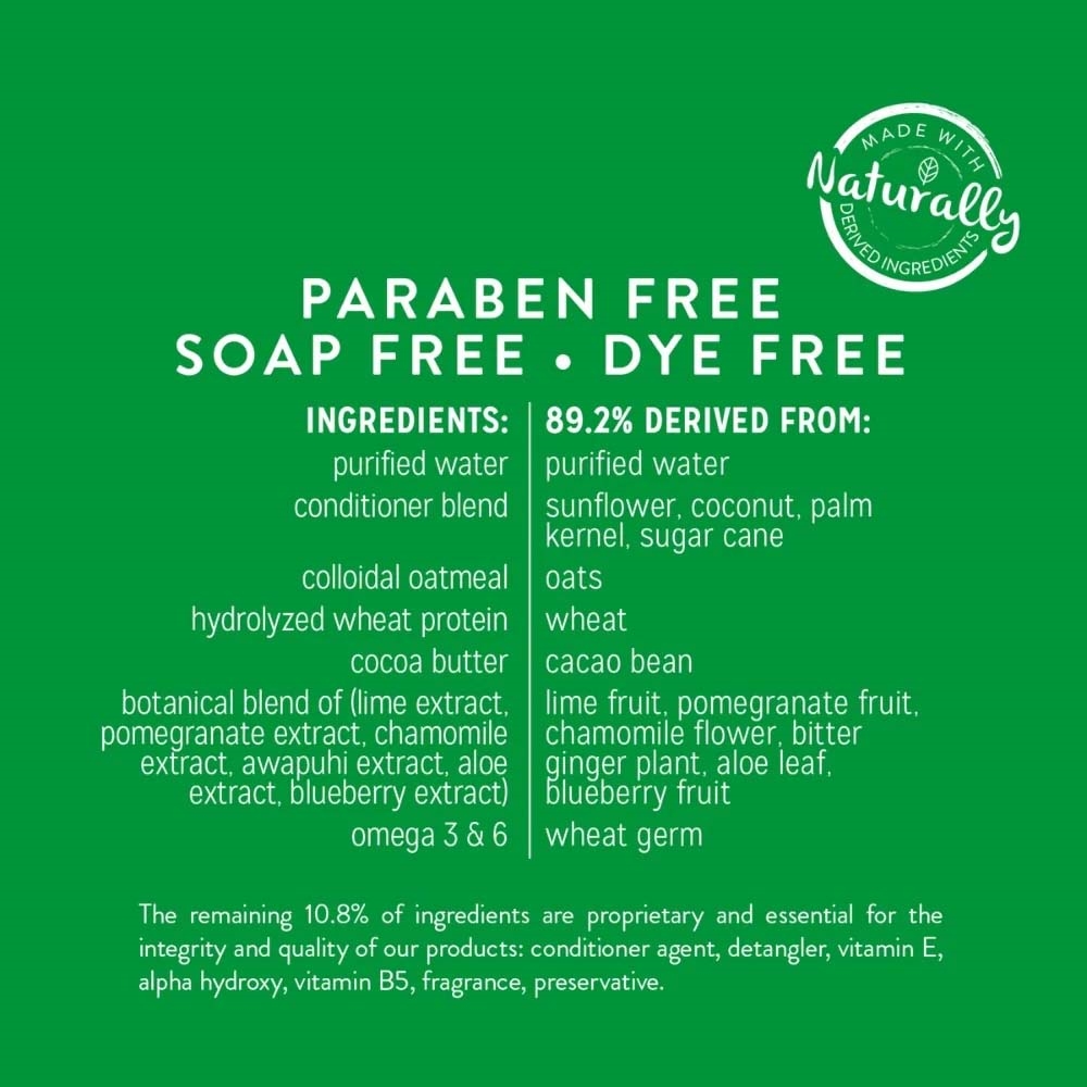 Flaskan innehåller 355 ml.Ingredienser: Vatten, balsamblandning, kolloid havregryn, hydrolyserat veteprotein, kakaosmör, botanisk blandning av (limeextrakt, granatäppleextrakt, kamomillextrakt, awapuhi-extrakt, aloe vera-extrakt, blåbärsextrakt), omega 3 och 6, balsammedel, utredningsmedel, E-vitamin, alfahydroxy, B5-vitamin, doftämne, konserveringsmedel.