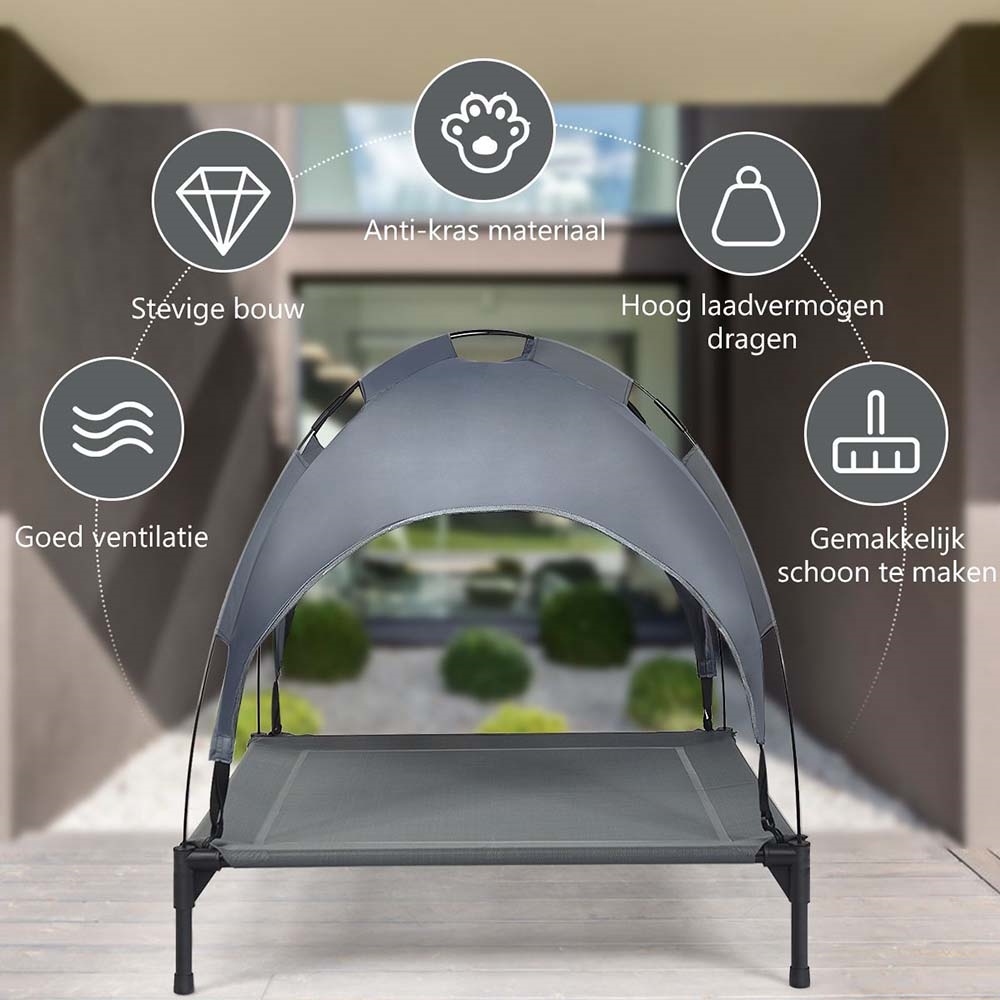 Upphöjd hundsäng med solsegel i färgen grå. Denna stabila och andningsbara hundsäng är lämplig för både inomhus- och utomhusbruk.