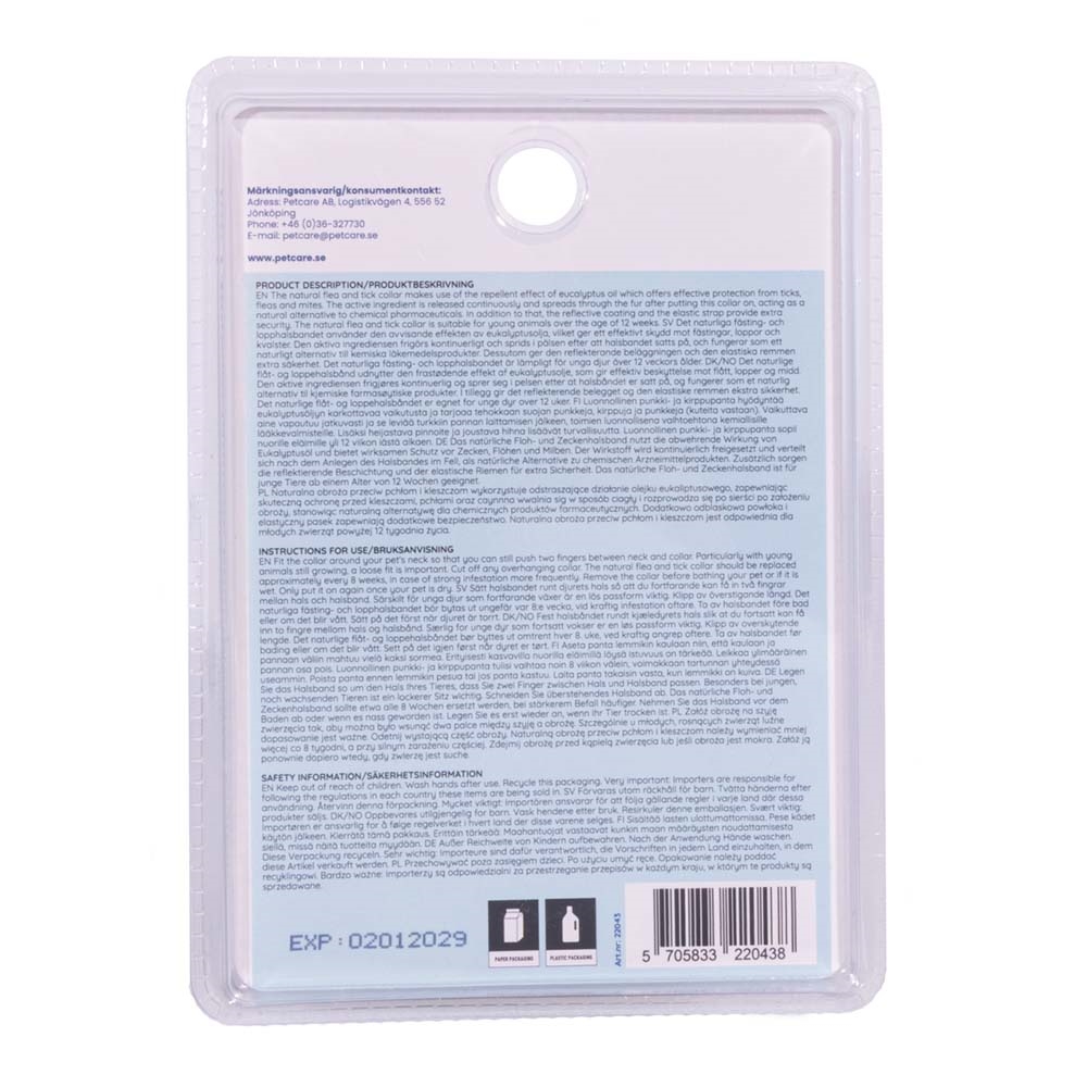 Det naturliga fästing- och lopphalsbandet utnyttjar den avstötande effekten av eukalyptusolja, som ger effektivt skydd mot fästingar, loppor och kvalster. Den aktiva ingrediensen frigörs kontinuerligt och sprider sig i pälsen efter att halsbandet satts på, och fungerar som ett naturligt alternativ till kemiska farmaceutiska produkter.