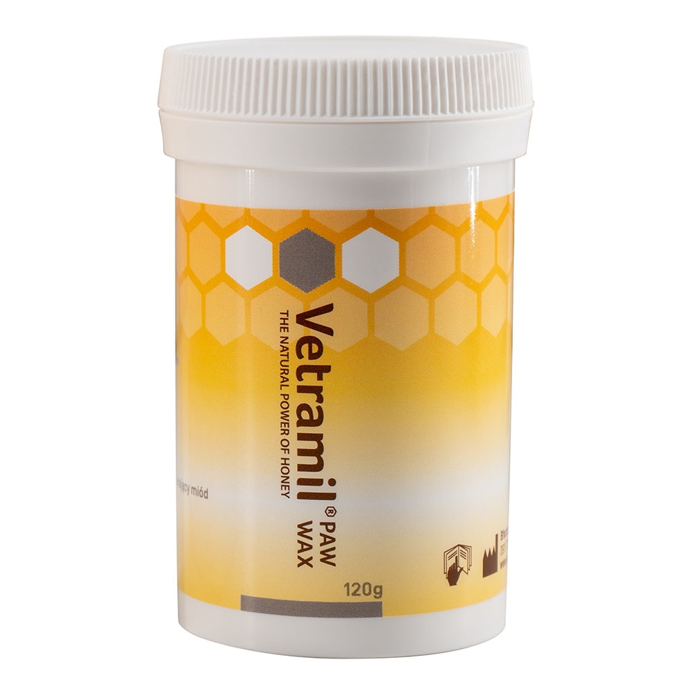 Bivaxet i tassvaxet bildar ett vattenavvisande lager som skyddar mot väder och extrema yttre påfrestningar. De eteriska oljorna i Vetramil tassvax främjar utvecklingen av en stark hud och bidrar till att förebygga skador, samtidigt som de ger en bitter smak som minskar djurens lust att slicka i sig det.
