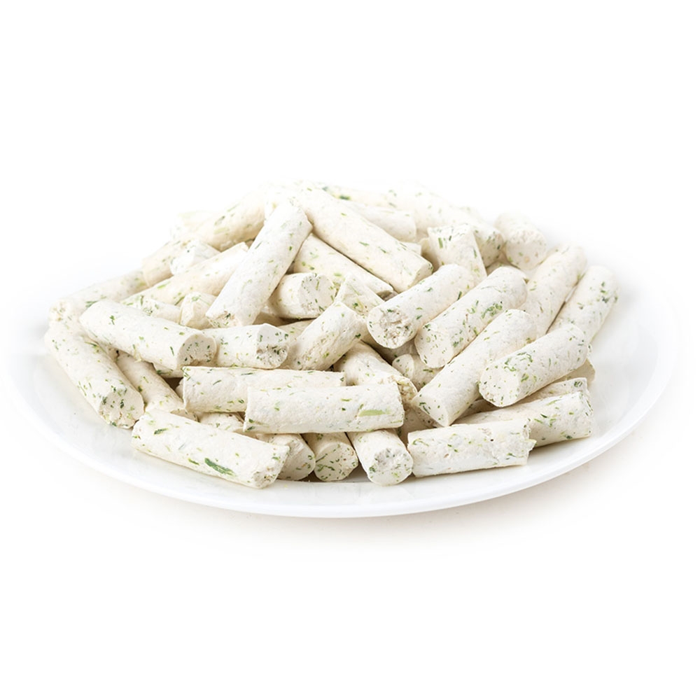 Dessa snacks innehåller kyckling, cellulosa, vetegroddar och E-vitamin. Med en hög proteinkoncentration på 66% är de både näringsrika och välsmakande.
