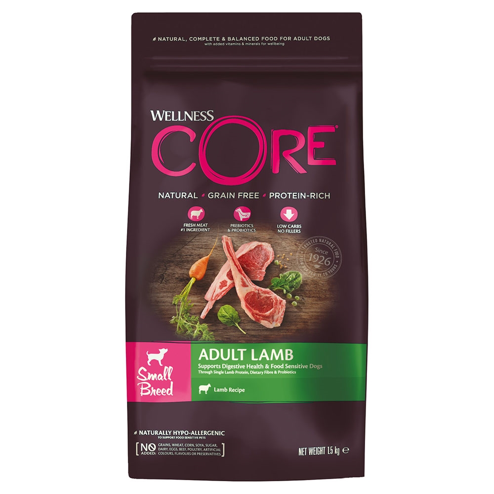 Detta kvalitetsfoder för vuxna hundar från Wellness Core är lämpligt för små raser. Fodret är särskilt utvecklat för att stödja matsmältningssystemet hos hundar som är foderkänsliga, genom att endast använda en proteinkälla, nämligen lamm.