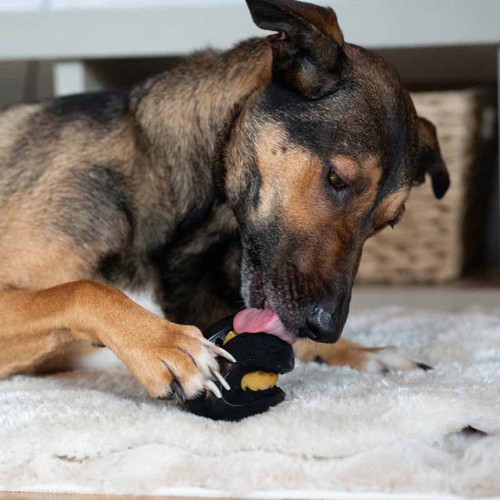 Bollen är tillverkad i mjukt men slitstarkt naturgummi och har inre fack som kan fyllas med din hunds favoritgodis eller smörbara snacks - och för extra skoj kan fyllningen frysas, så bollen med fyllningen blir till en sval och utmanande lek på varma dagar.